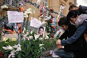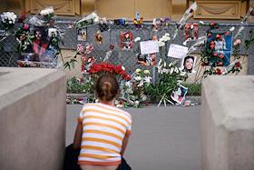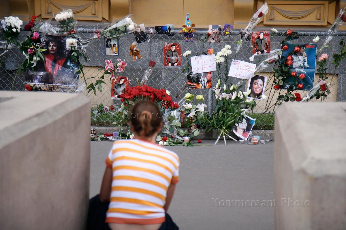 Цветы у ограды посольству США в России, принесенные москвичами в память о американском певце Майкле…