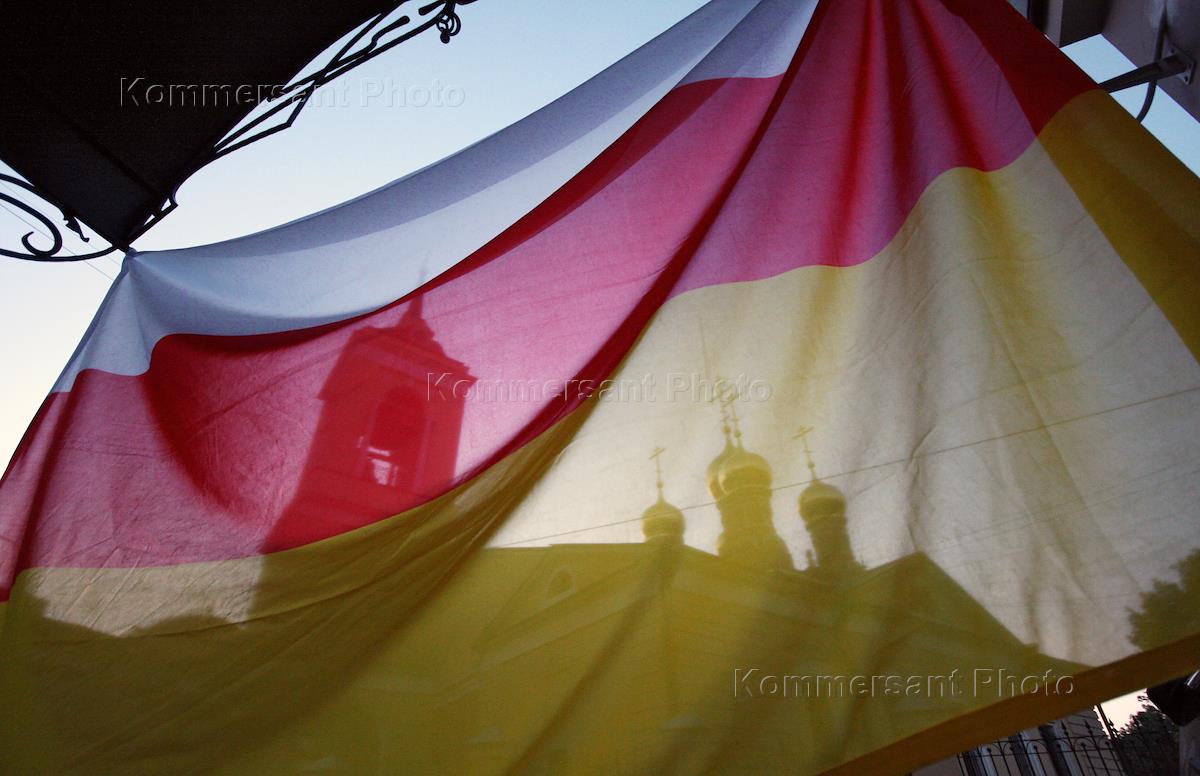 Жанровая фотография. Купола церкви сквозь полотнище флага Осетии.