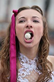 Участница парада невест с конфетой во рту.