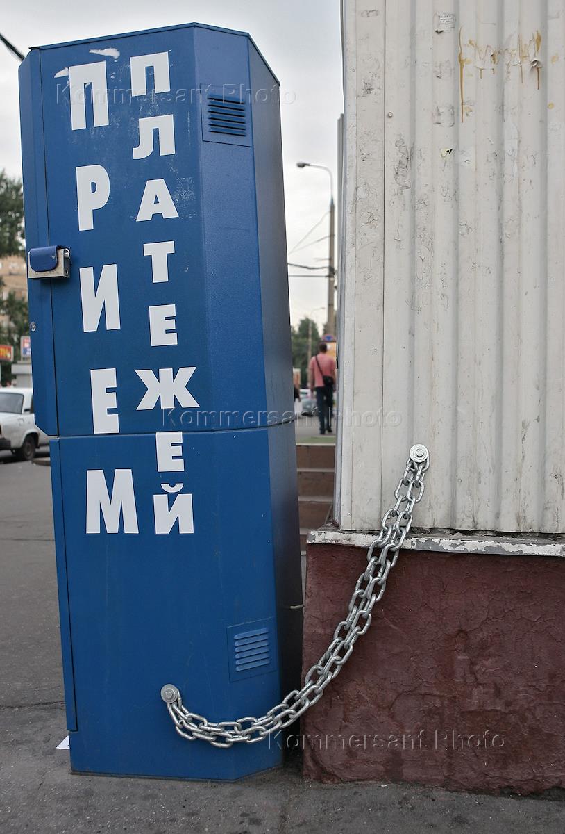 Жанровая фотография. Терминал приема платежей, прикованный цепью.