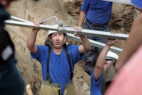 Операция МЧС по извлечению двух засыпанных в траншее рабочих. Спасатель МЧС работает с домкратом во…