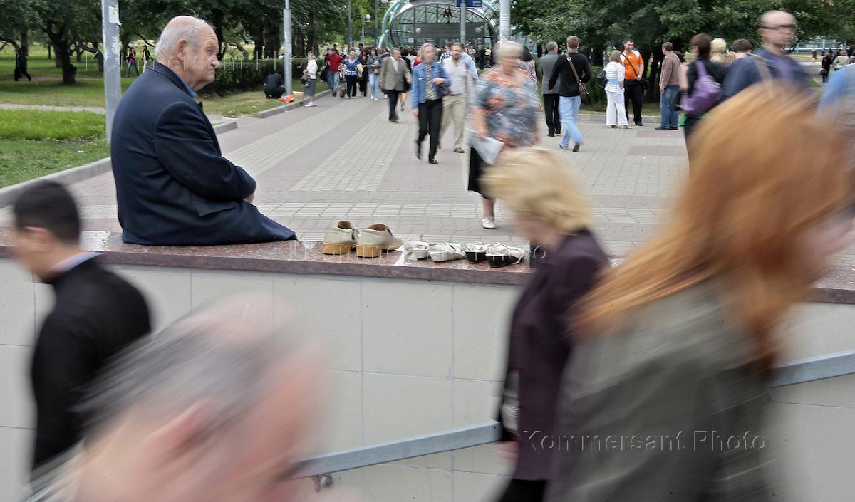Жанровая фотография. Пожилой человек торгует старой обувью на парапете.