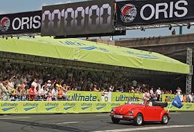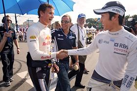 Гонщики Давид Кулхард (второй слева) и Казуки Накаджима (справа) после участия в автомобильном шоу…
