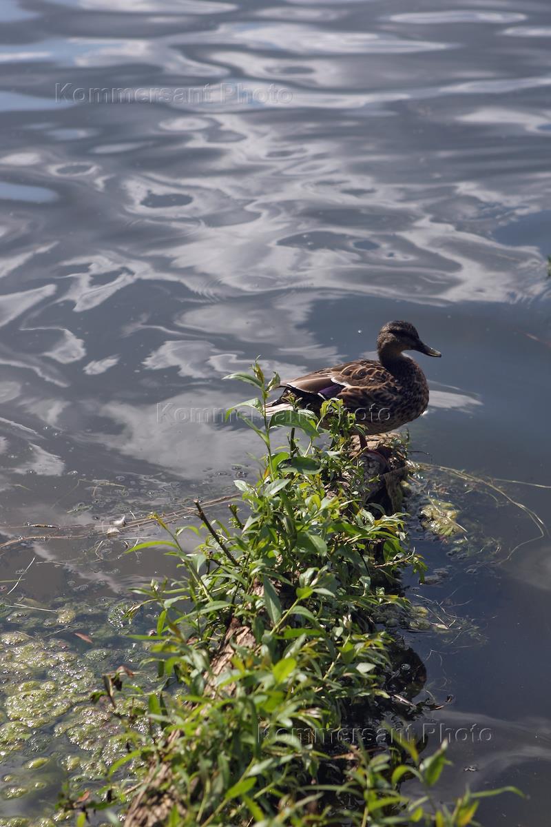 Жанровая фотография. Утка на берегу водоема.