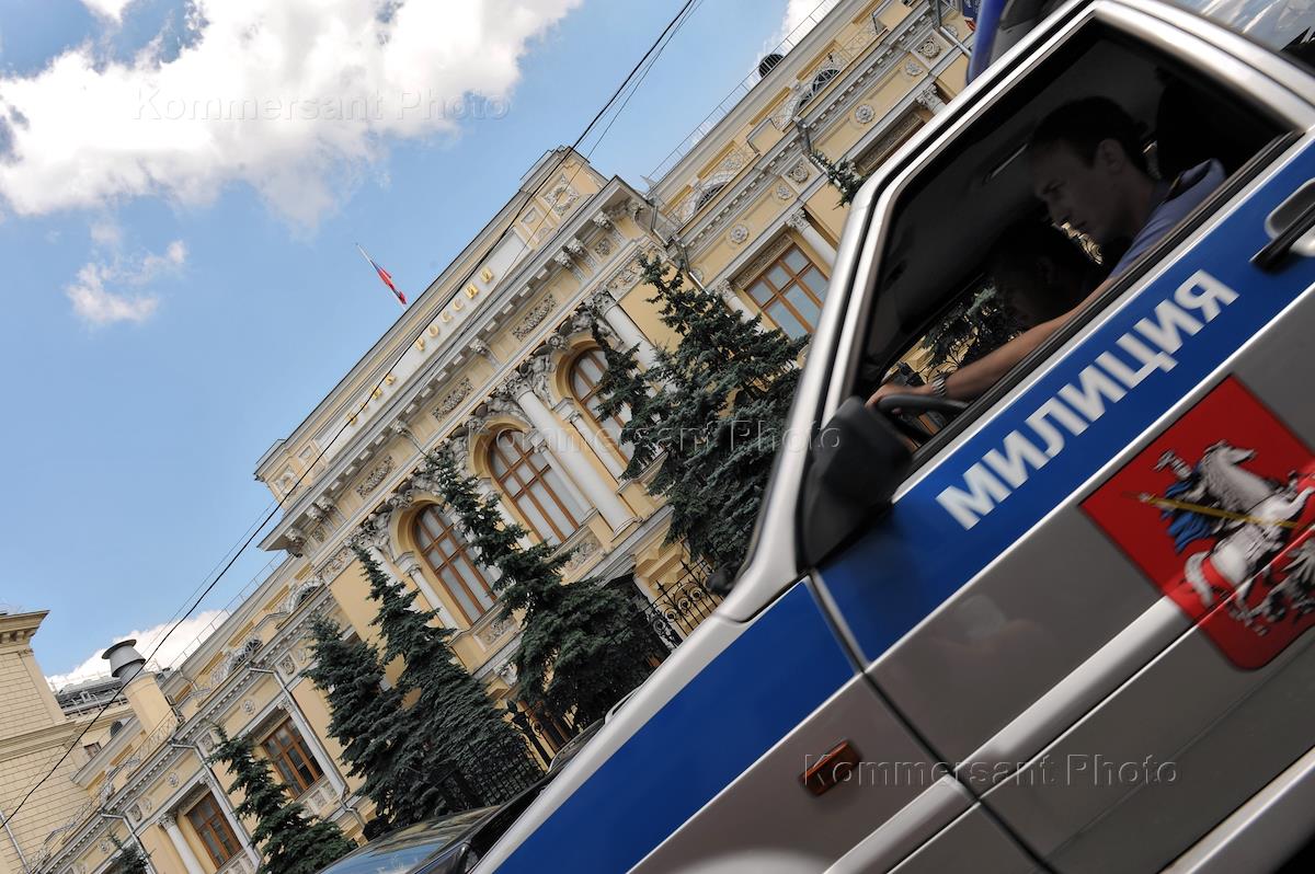 Автомобиль милиции у здания Центрального Банка России на улице Неглинной.