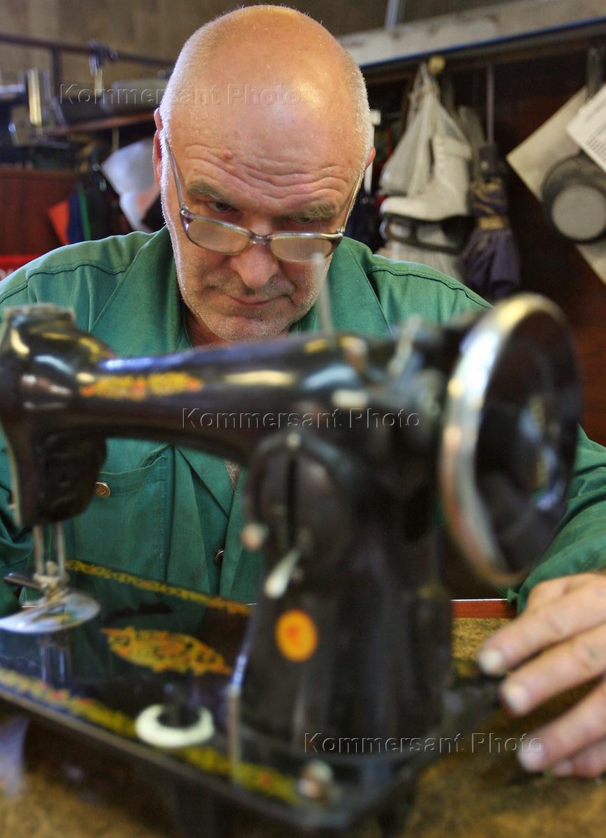 Мастерская по ремонту ООО "Металлоремонт на Новослободской". Мастер чинит швейную машинку.