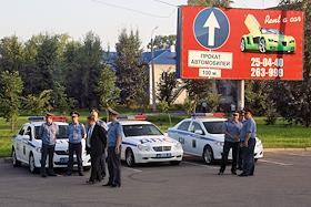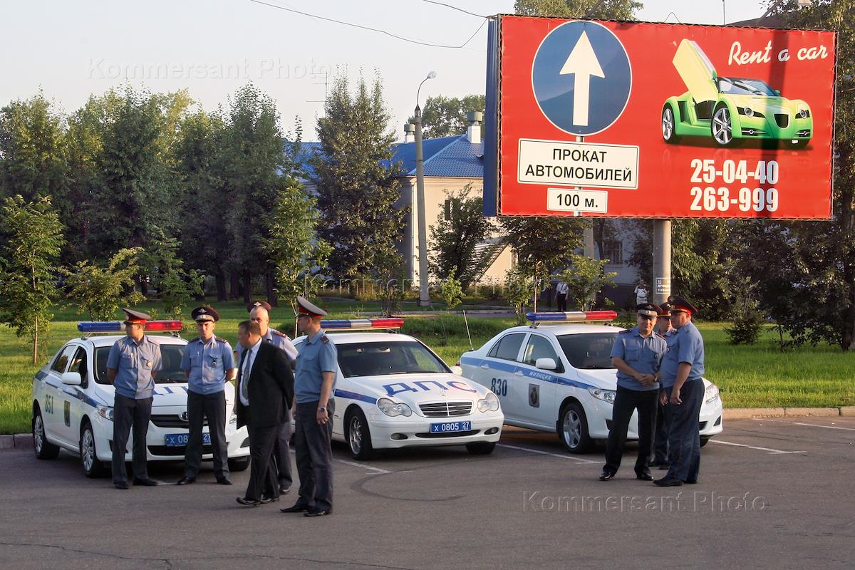 Жанровая фотография. Сотрудники Дорожно-патрульной службы (ДПС) рядом со служебными автомобилями и…