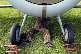 Жанровая фотография. Авиаконструкторы-любители переливают авиационный керосин на аэродроме…