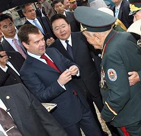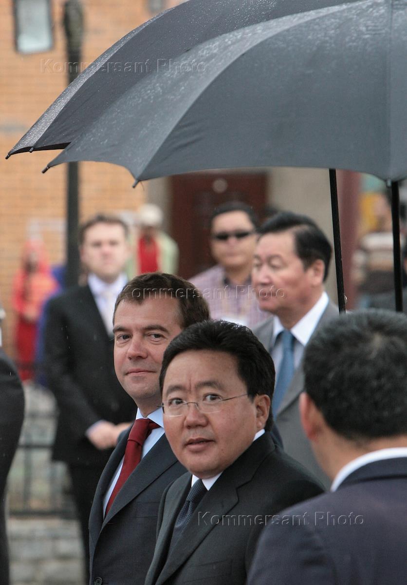 Президент России Дмитрий Медведев (слева) и президент Монголии Цахиагийн Элбэгдорж (справа) во время…