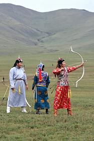 Монгольский народный праздник Наадам. Участники праздника в национальных костюмах во время…