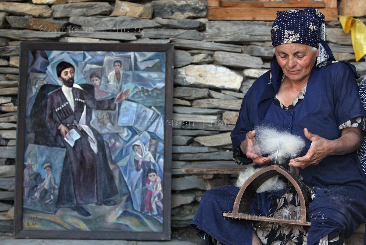 Жанровая фотография. Пожилая женщина во время обработки шерсти.