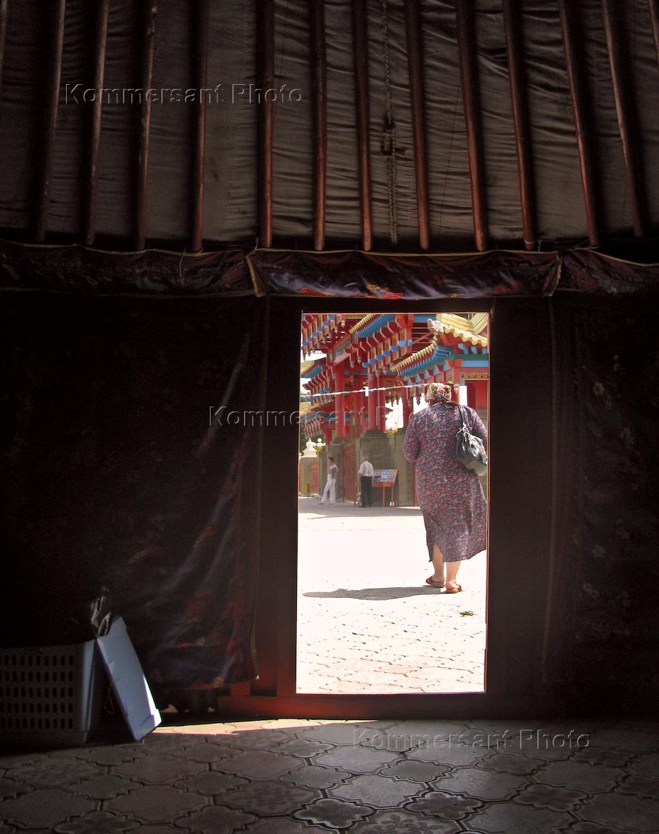 Жанровая фотография. Женщина молится у главного буддийского храма республики в Элисте.