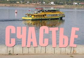 Жанровая фотография. Надпись "Счастье" на фоне речного пейзажа