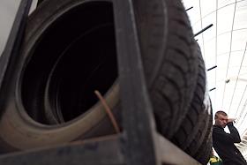 Жанровая фотография. Рынок "Садовод". Продавец у прилавка с автомобильными шинами.