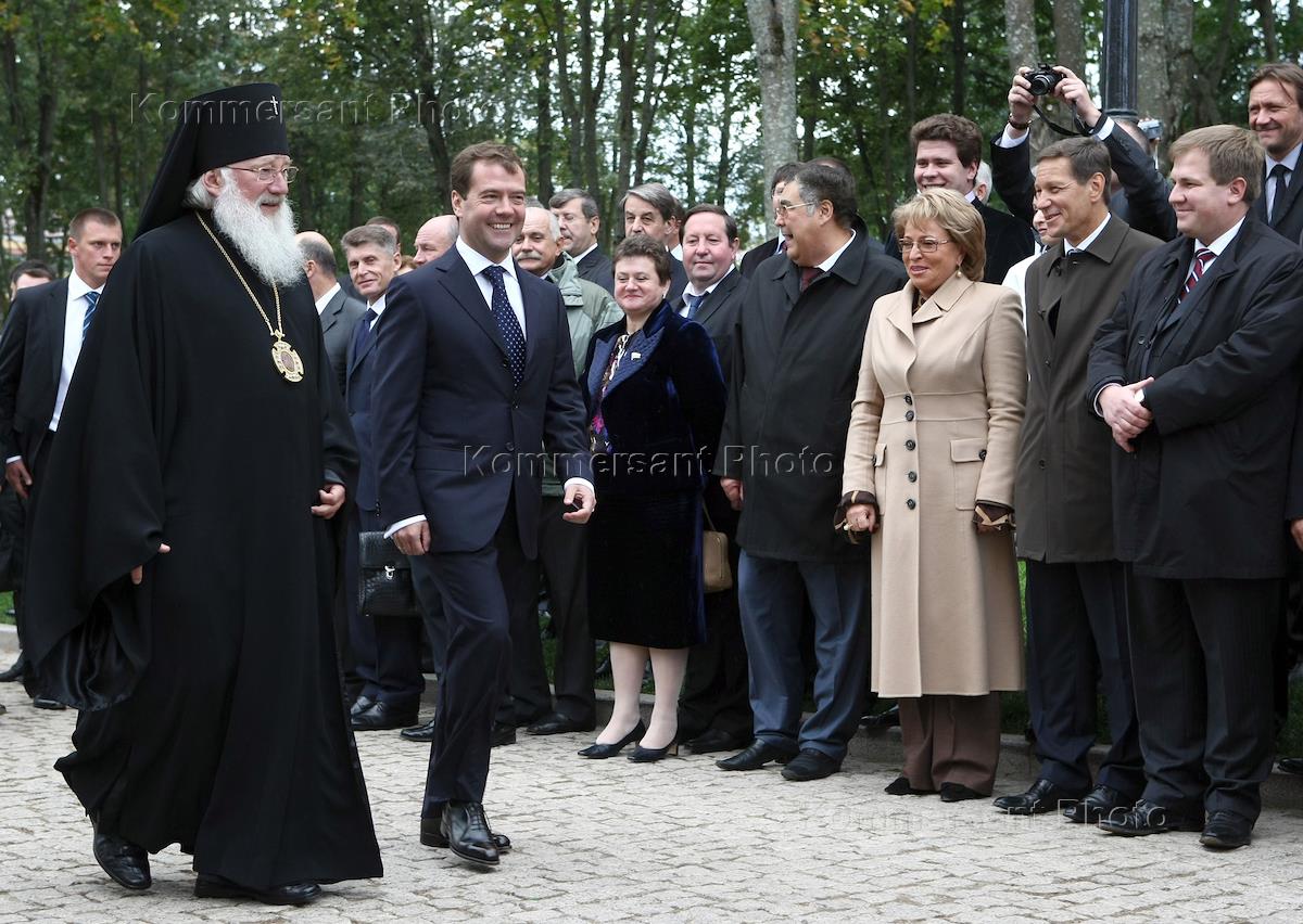 Архиепископ Новгородский и Старорусский Лев (слева), президент России Дмитрий Медведев (второй…