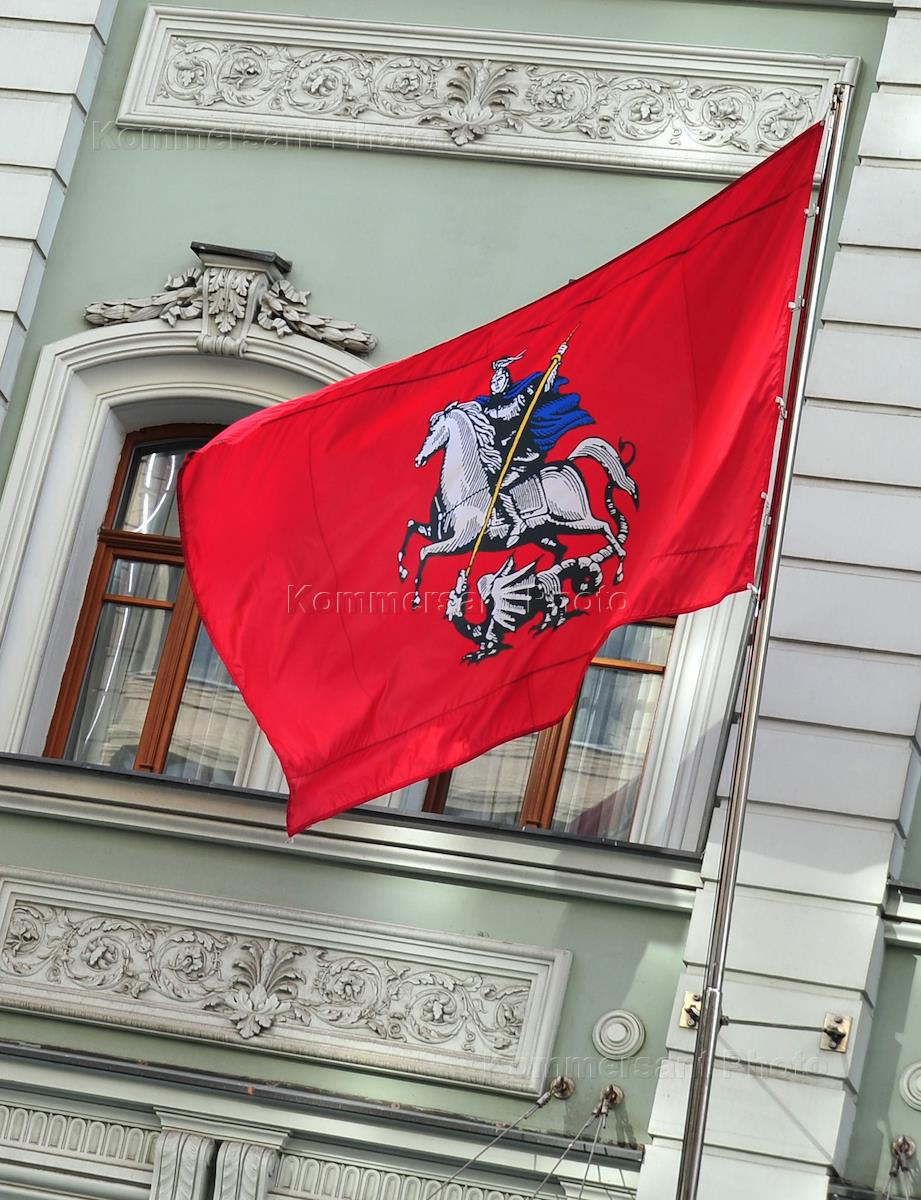 Жанровая фотография. Флаг Москвы на здании в центре города.