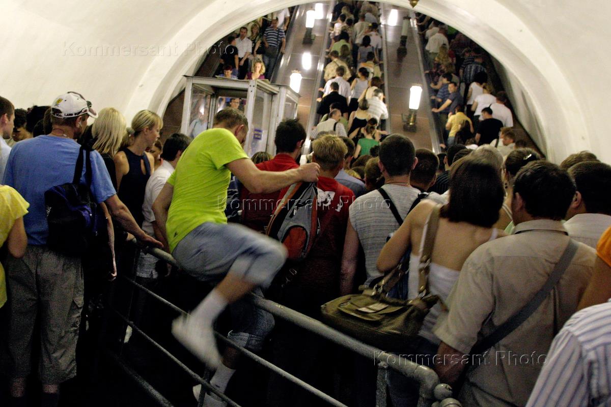 Жанровая фотография. Пассажиры у эскалатора метро в час пик.