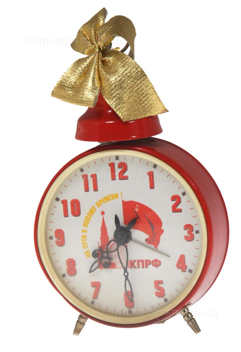 Будильник с логотипом Коммунистической партии России (КПРФ) "На пути к новому времени!" в фотостудии ИД "КоммерсантЪ".