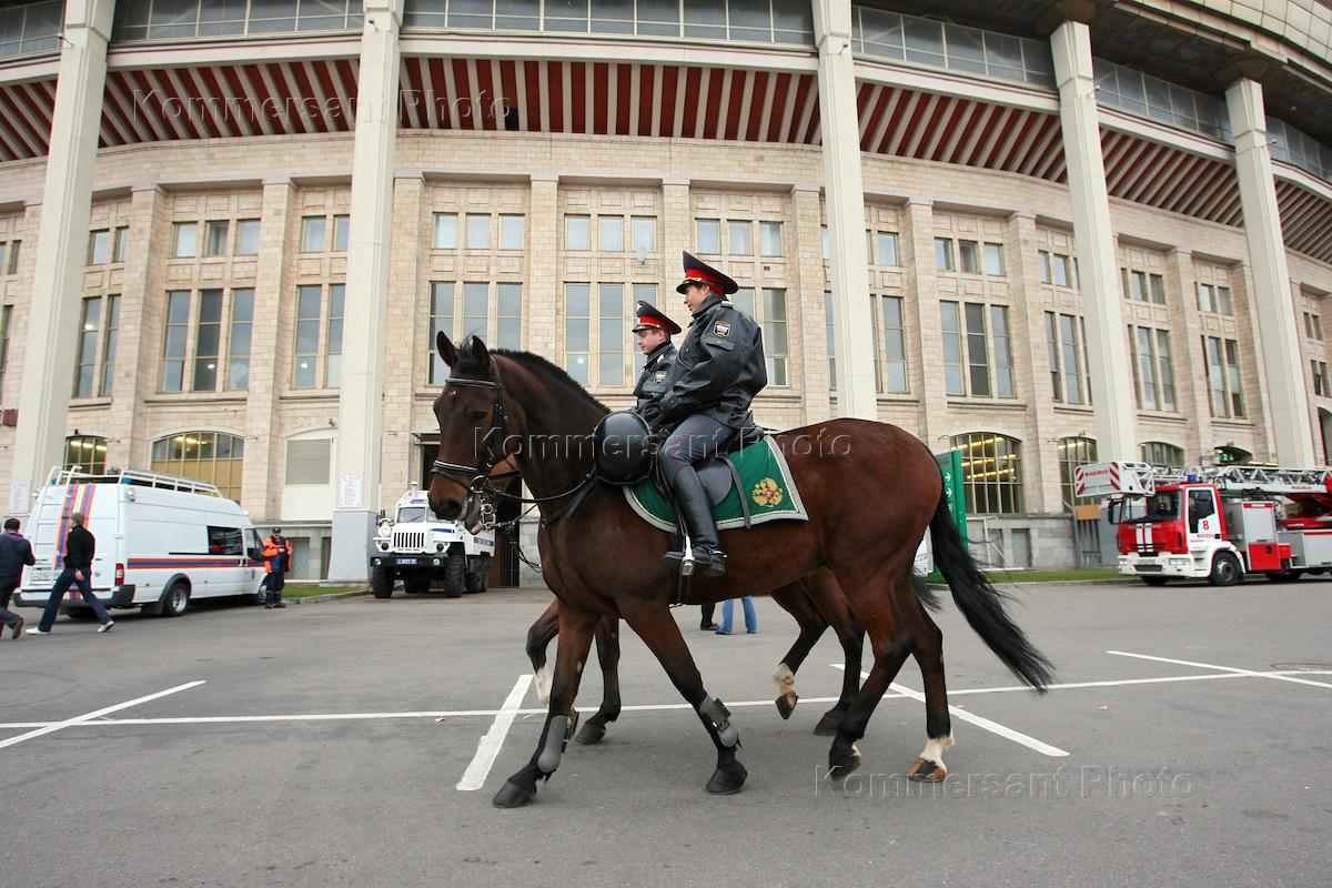 Сотрудники конной милиции во время дежурства на территории спортивного комплекса "Лужники".