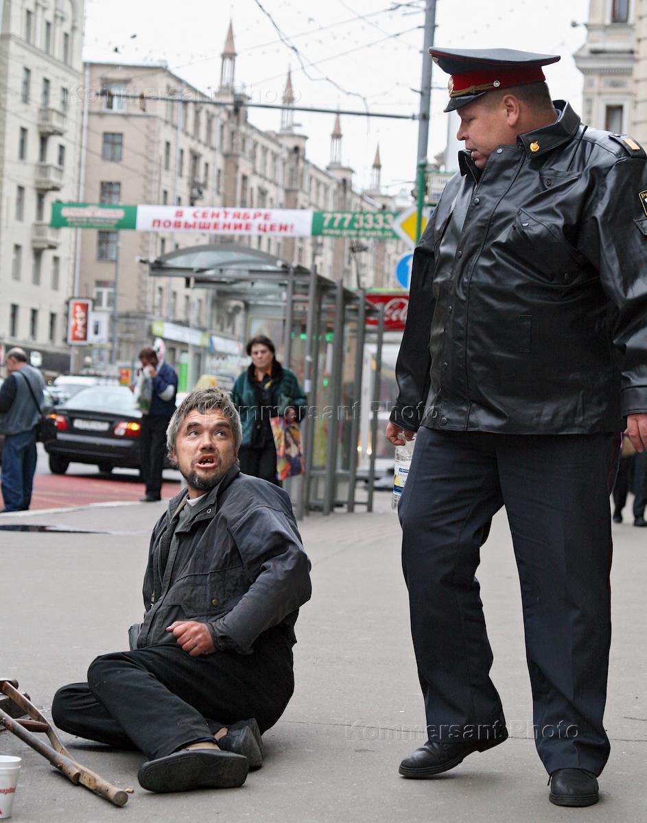 Милиционер поднимает мужчину-инвалида, который просит милостыню на Тверской улице.