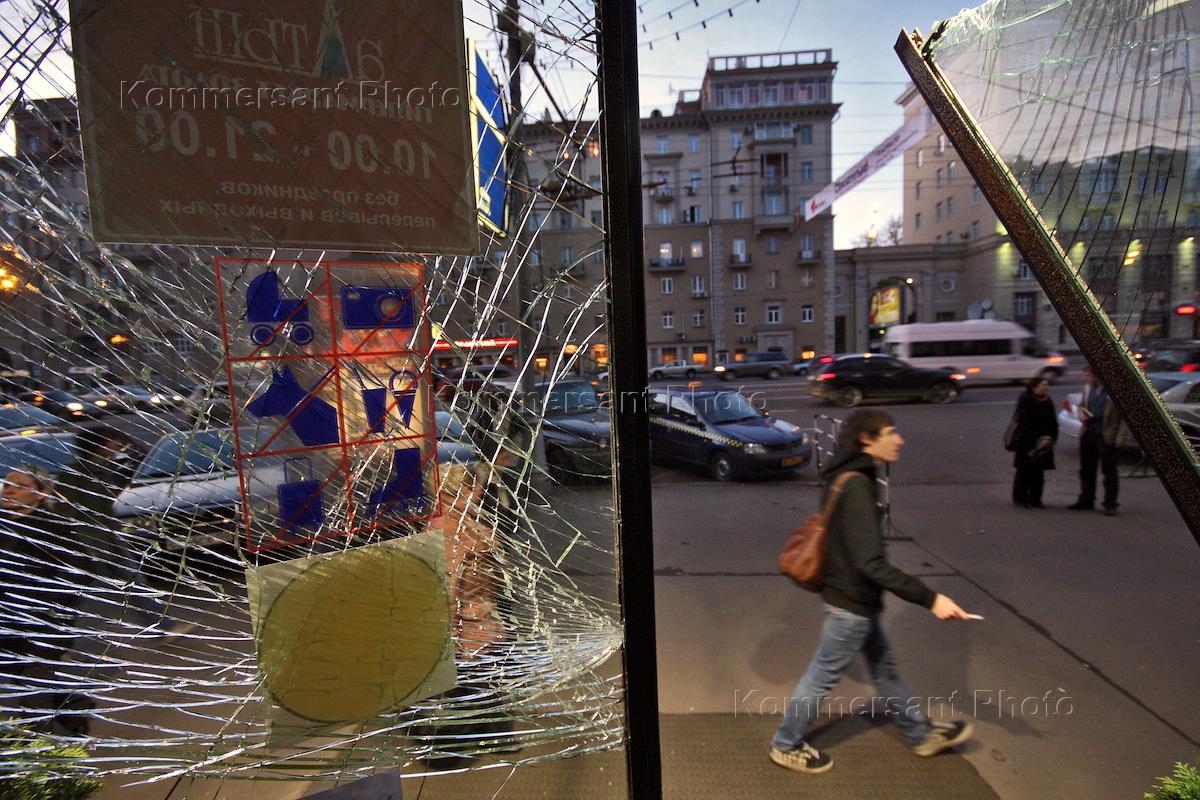 Разбитая витрина ювелирного магазина сети гипермаркетов золота "Алтын", где прошел обыск…