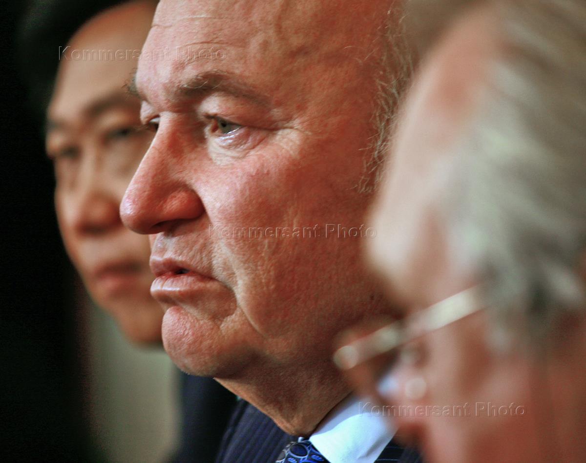 Мэр Москвы Юрий Лужков (в центре) во время пресс-конференции на тему "Выход из кризиса - не ждать, а…