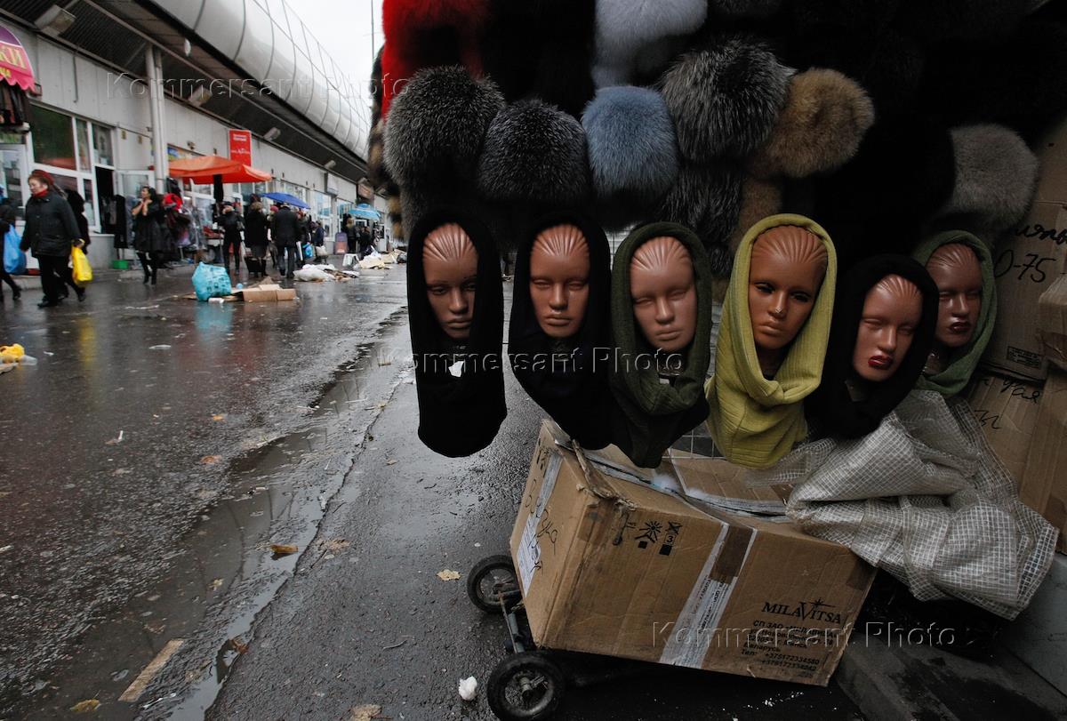 Жанровая фотография. Павильон, торгующий головными уборами на рынке у стадиона "Лужники".