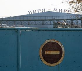 Жанровая фотогрвфия. Дорожный знак "Въезд запрещен" ("кирпич") на воротах предприятия Втормет".…