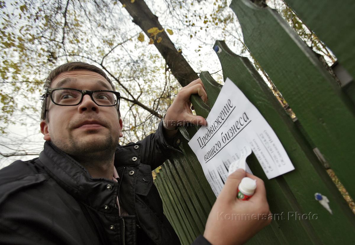 Корреспондент журнала "Деньги" ИД "КоммерсантЪ" Ждакаев Иван наклеивает рекламное объявление.