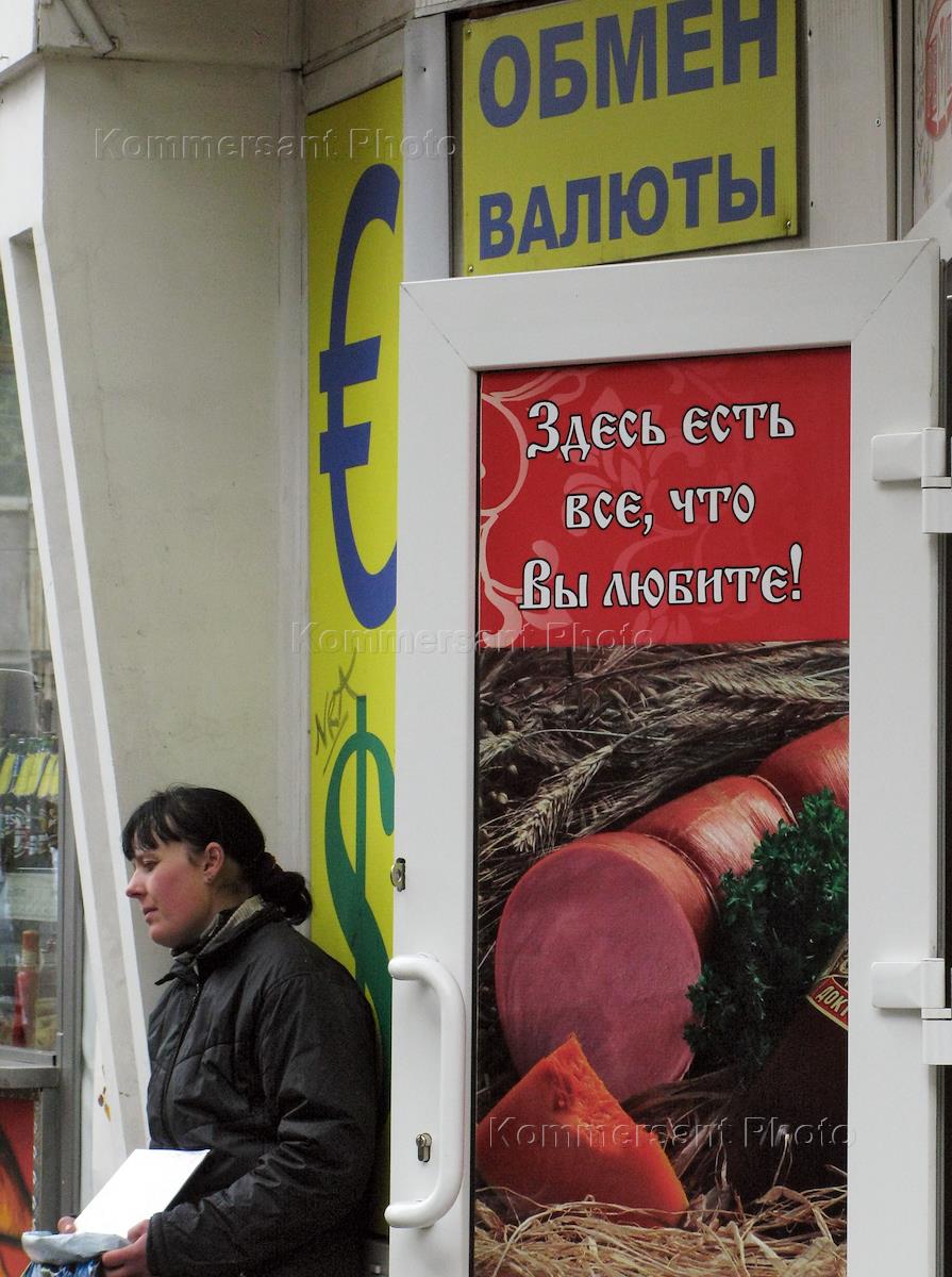 Жанровая фотография. Обменный пункт валюты и входная дверь в продовольственный магазин с рекламой…