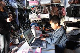 Рынок кожгалантерейная лавка, китайский мальчик играет на ноутбуке.