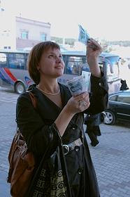 Жанровая фотография. Девушка европейской внешности рассматривает китайские деньги (юани).