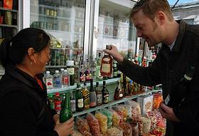 Продовольственный городской рынок. Человек покупает французский коньяк Hennessy (Хеннесси).