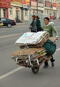 жанровая фотография. Китаянка на одноколесной тачке везет картонные ящики.