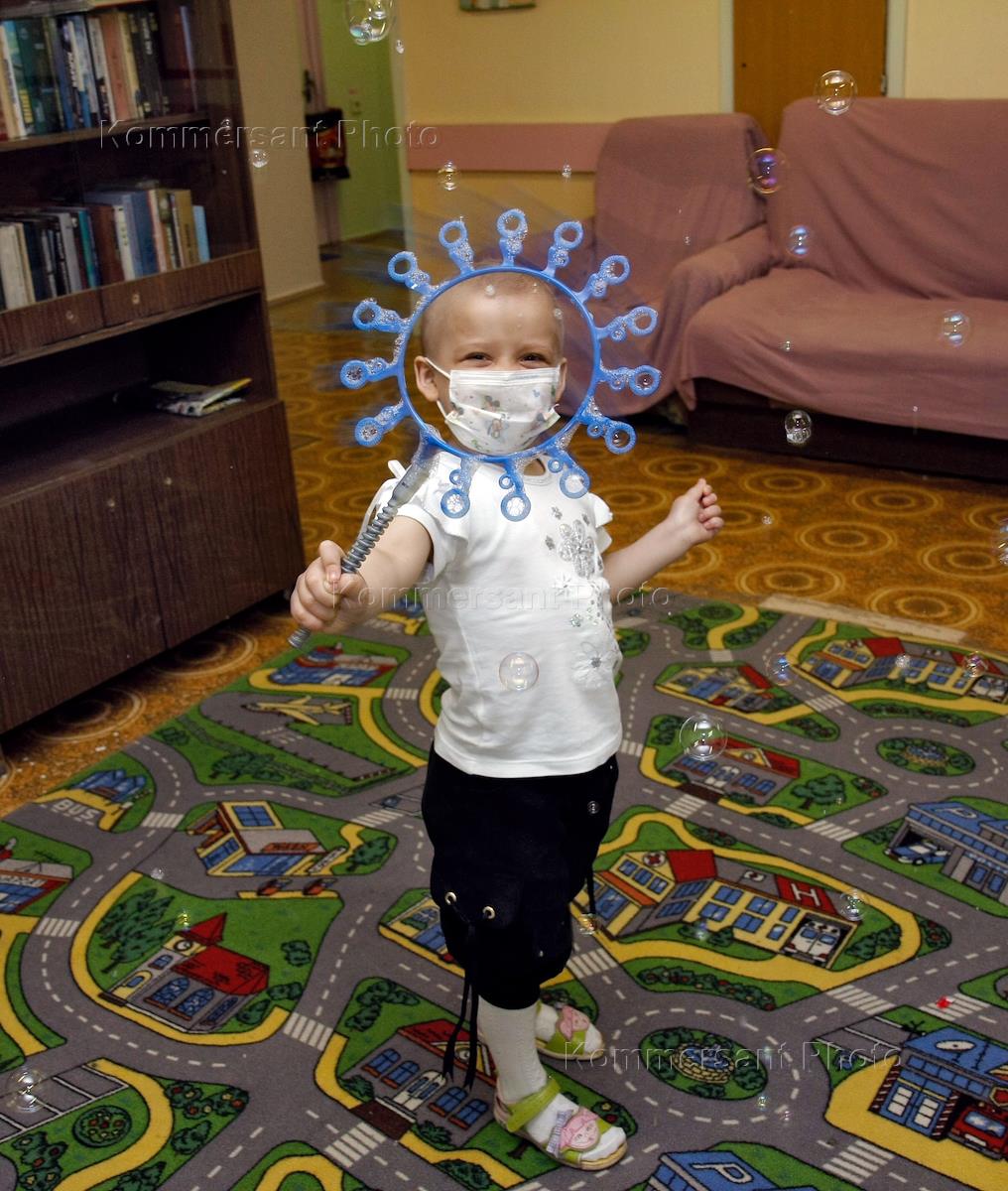 Больной ребенок на встрече с волонтерами-клоунами в Российской Детской Клинической Больнице (РДКБ).