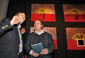Художники Олег Кулик (слева) и Анатолий Осмоловский (справа) на церемонии открытия выставки…