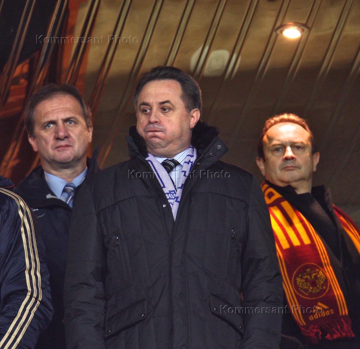 Главный тренер сборной России по футболу Гус Хиддинк (слева) во время отборочного матча Чемпионата…