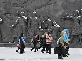 Жанровая фотография. Школьники у монумента "Покорителям космоса". Фрагмент барельефа у основания…