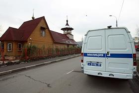 Автомобиль милиции на месте убийства священника Даниила Сысоева рядом с храмом Святого апостола Фомы…