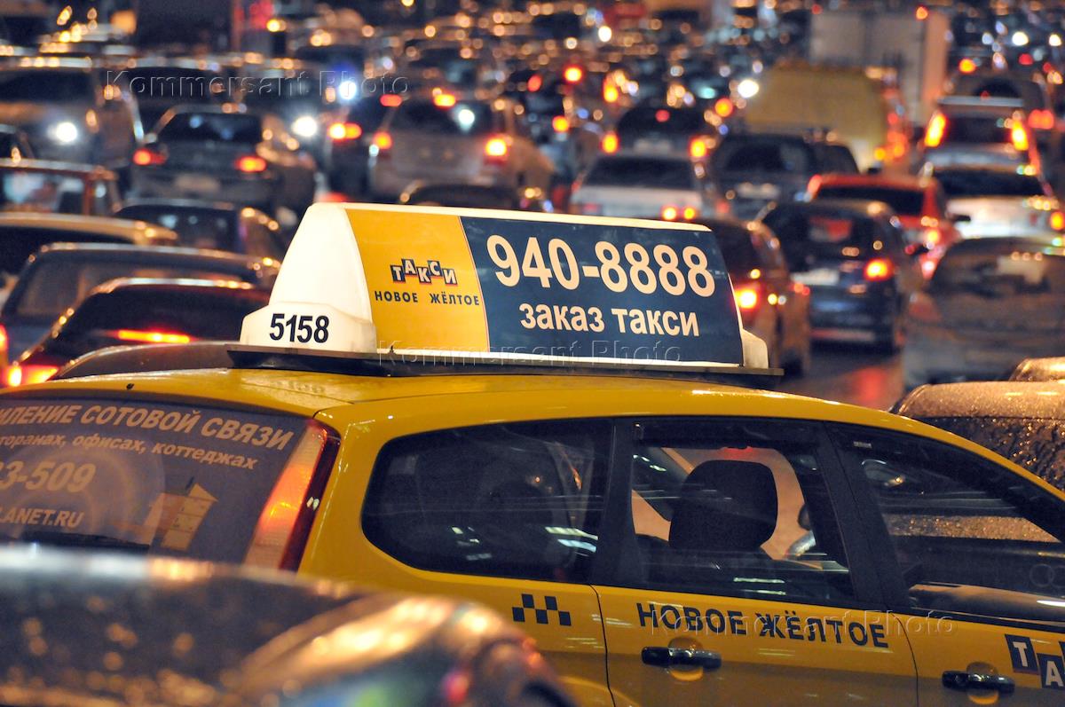 Жанровая фотография. Автомобильная пробка. Машина "Нового желтого такси" на улице города.