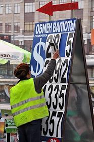 Жанровая фотография. Сотрудник пункта обмена валюты меняет курс доллара.