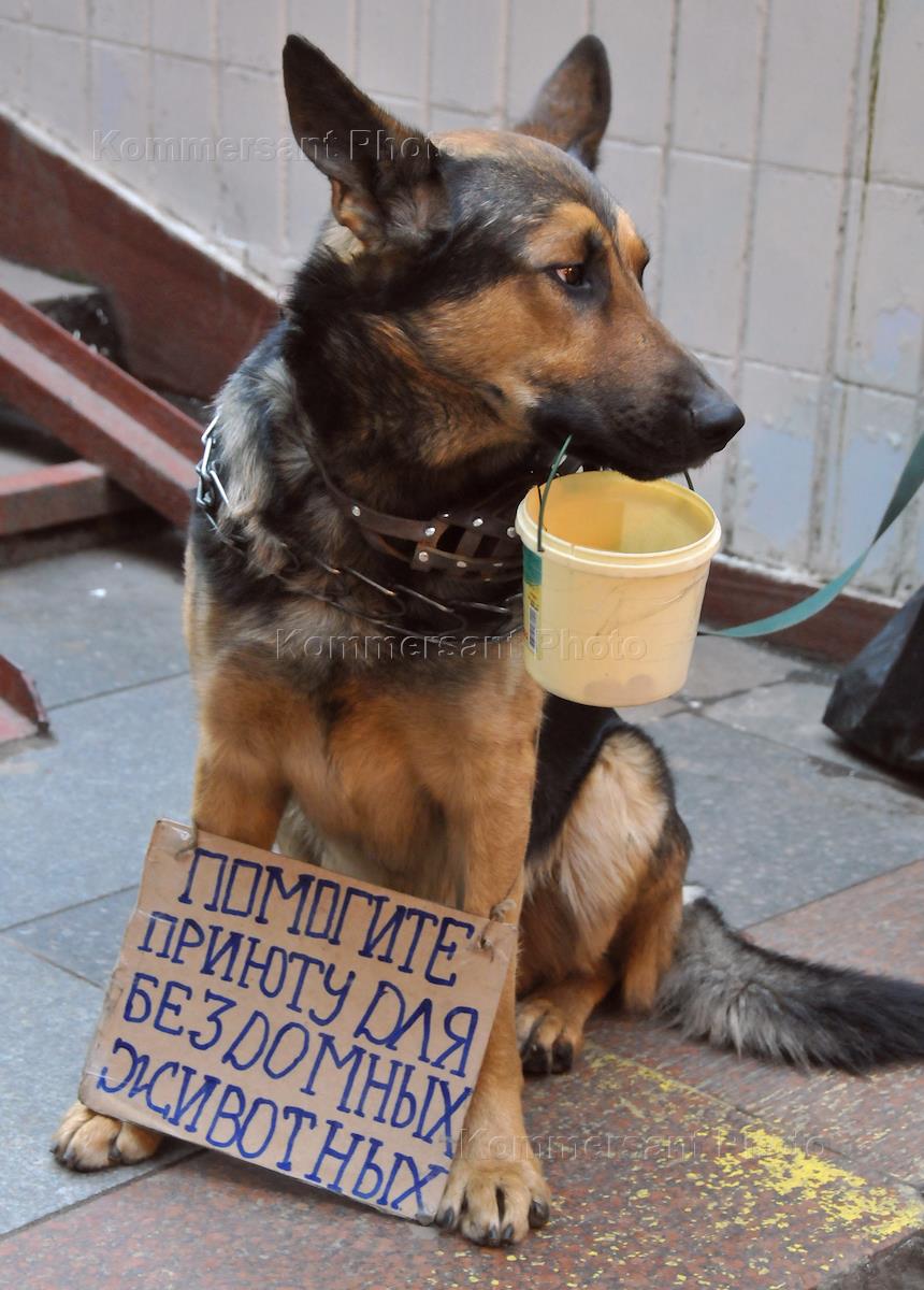 Жанровая фотография. Собака с табличкой "Помогите приюту для бездомных животных" и ведерком для…