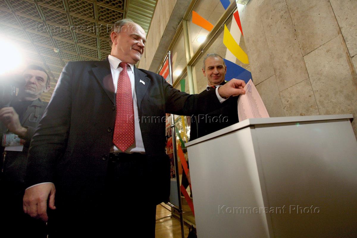 Лидер Коммунистической партии Российской Федерации (КПРФ) Геннадий Зюганов (в центре) во время…