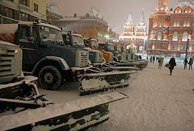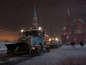 Автомобили коммунальной службы Москвы во время уборки снега на Красной площади.