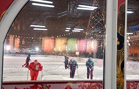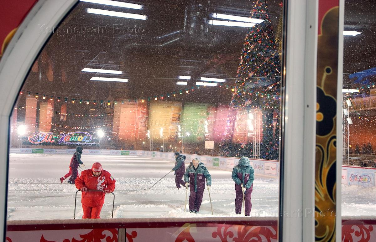 Жанровая фотография. Уборка снега на катке "ГУМ-Каток" на Красной площади.