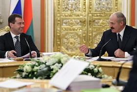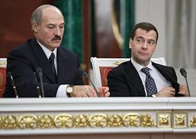 Президент республики Беларусь Александр Лукашенко (слева) и президент России Дмитрий Медведев…