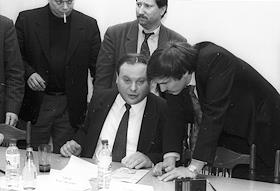 Первый заместитель председателя правительства России Егор Гайдар (в центре) во время встречи с…