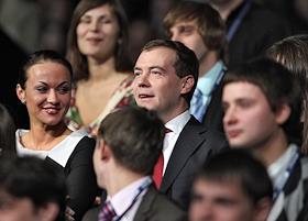 Президент России Дмитрий Медведев (в центре) на Всероссийском Форуме победителей "Прорыв" в…