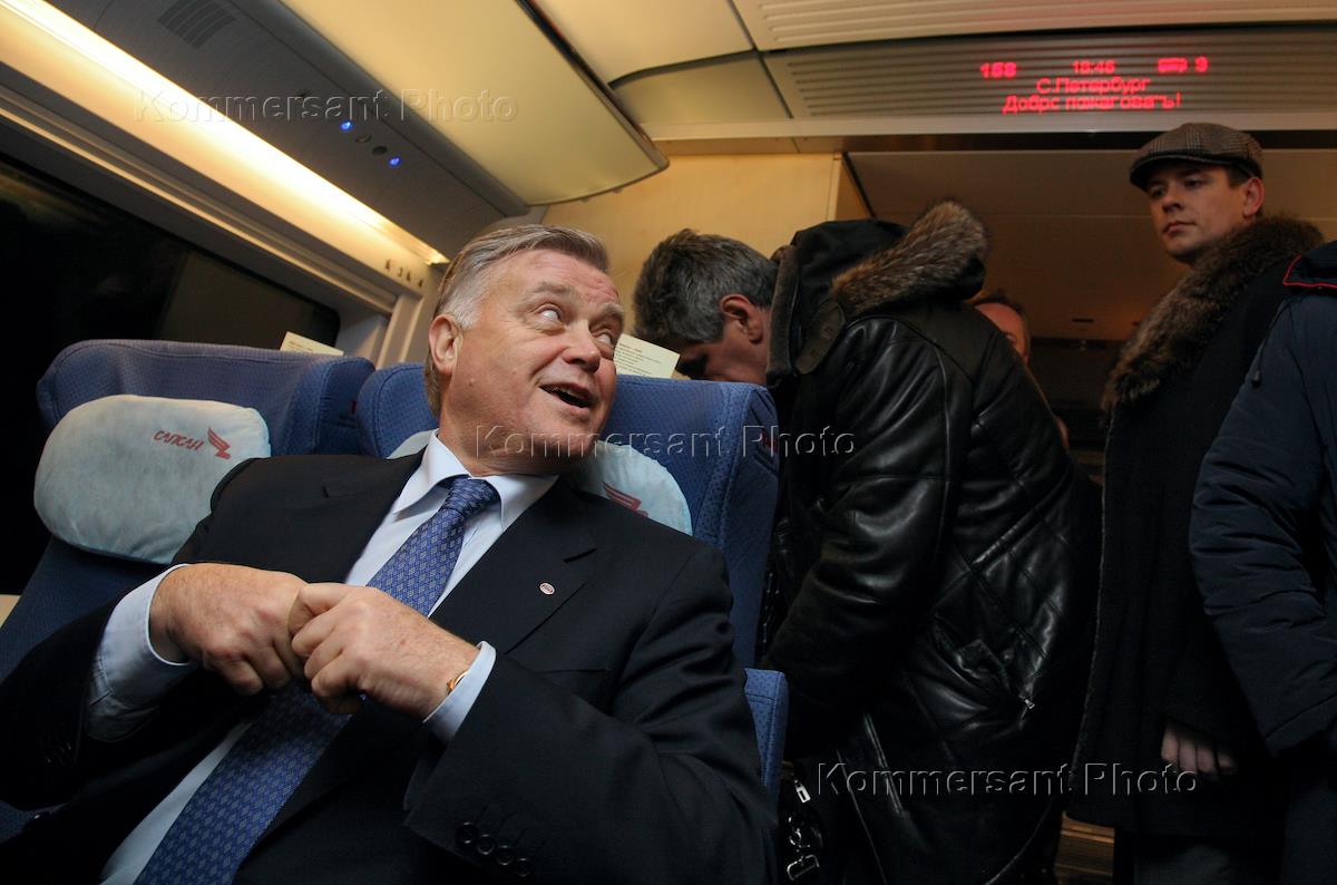 Президент ОАО "Российские железные дороги" (РЖД) Владимир Якунин (слева) в вагоне первого рейса…