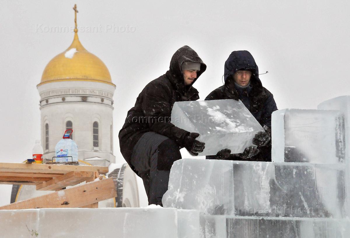 Жанровая фотография. Постройка сказочного ледяного городка на Поклонной горе.